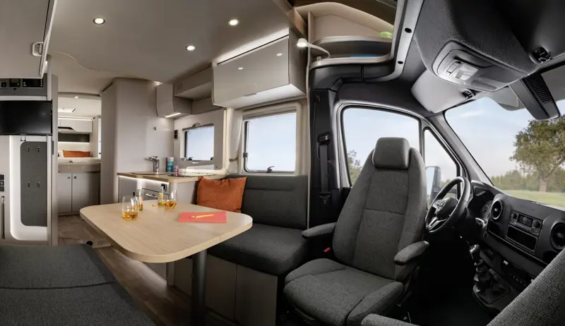 The HYMER T-Class S is the first of its kind in many ways. The interior boasts a cosy ambience with modern designer touches that are typical of HYMER, a smart lighting concept, as well as a particularly generous feeling of space. It is based on the proven and technologically superior Mercedes-Benz front-wheel drive chassis with original frame. Thanks to its straightforward handling, it is also the ideal first HYMER for everyone who wants to enter the world of motorhoming on a high level.